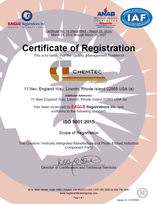 As a division of ChemArt, ChemTecUSA has carried forward a legacy of quality innovation since 1976. From our earliest photochemical machining processes to our current in-house production model, we’ve emphasized quality at every level—from design support and tooling setup to inspection and delivery. Each department is accountable to our quality standards, and every team member is trained to identify and address risks before they affect your parts.